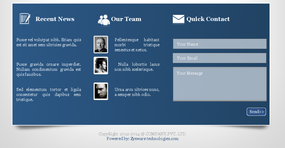 Finally, we have a footer section. In the footer section we have 2 regions. That is the footer region and copyright region. In the footer region we can add three blocks like the design. To get a styled form inputs like the design, you have to style the footer section form inputs.