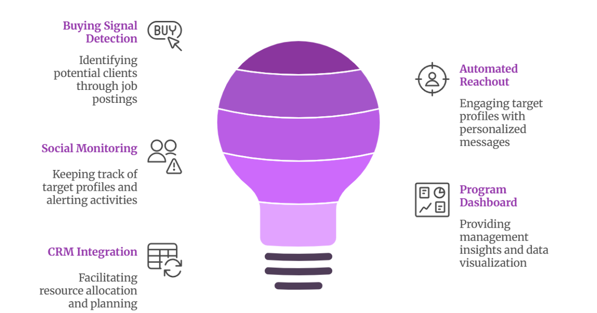 - Manual Detection of Buying Signals: The process of monitoring job boards, analyzing companies, identifying decision-makers, and initiating outreach based on buying signals (e.g., job postings) was entirely manual